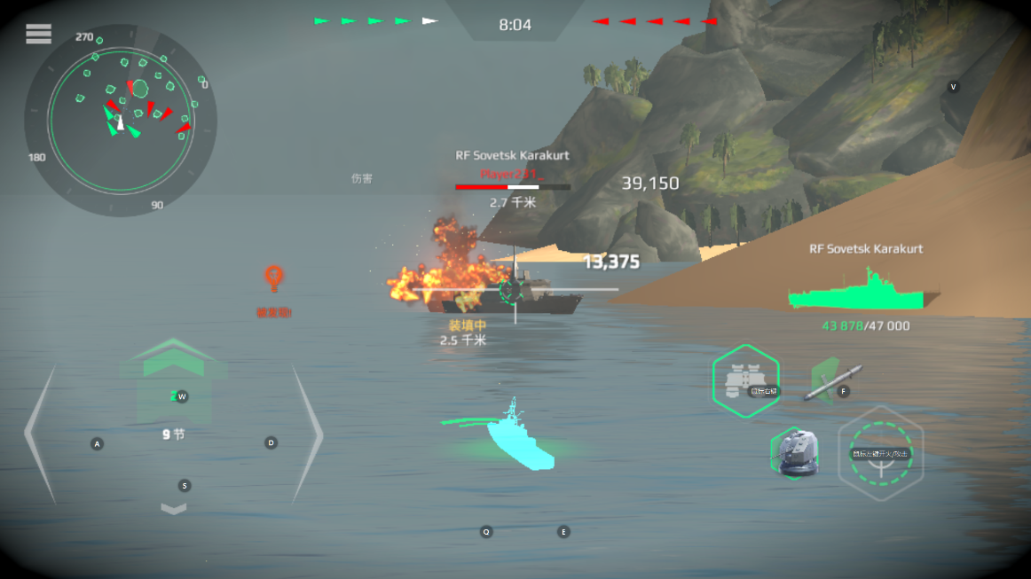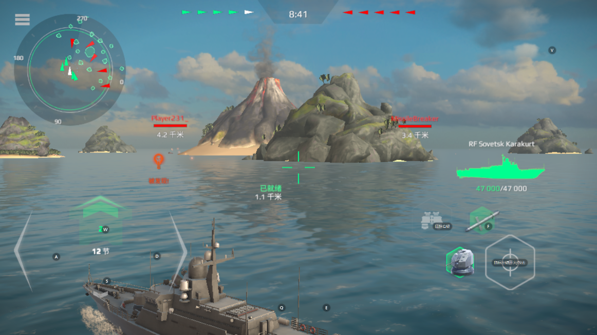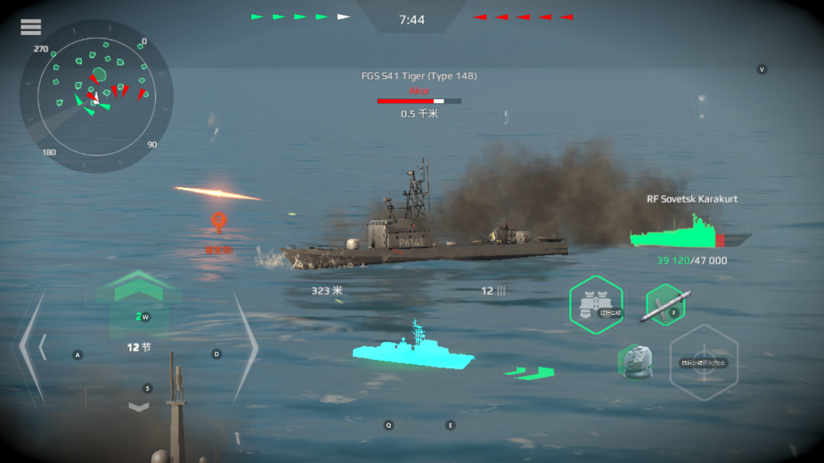 4、按两下前进键即可自动按最大速度前进,将准许移动到敌舰方向,雷达自动缩地敌方。