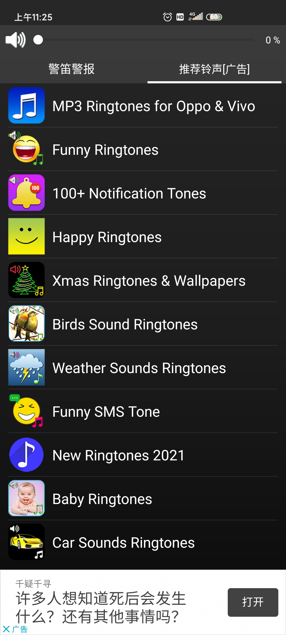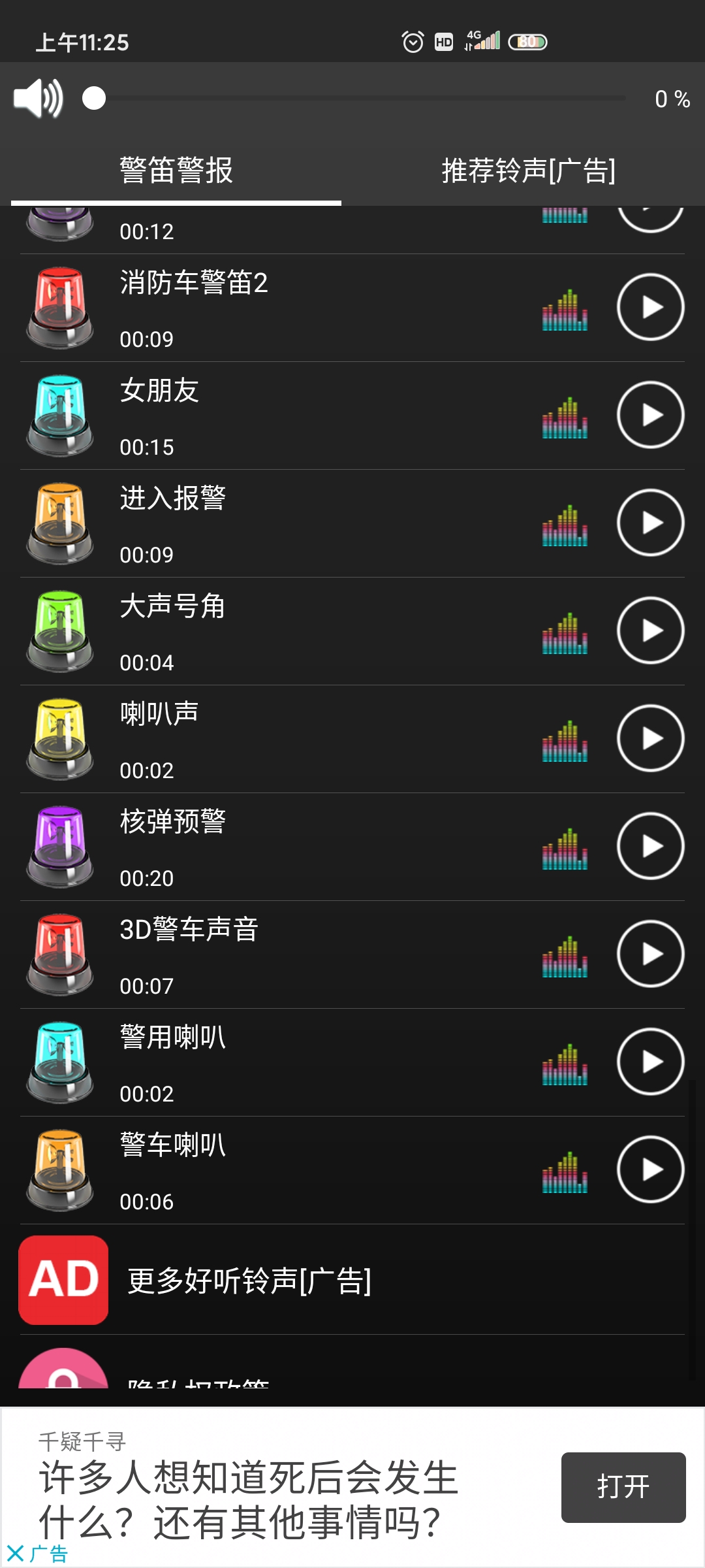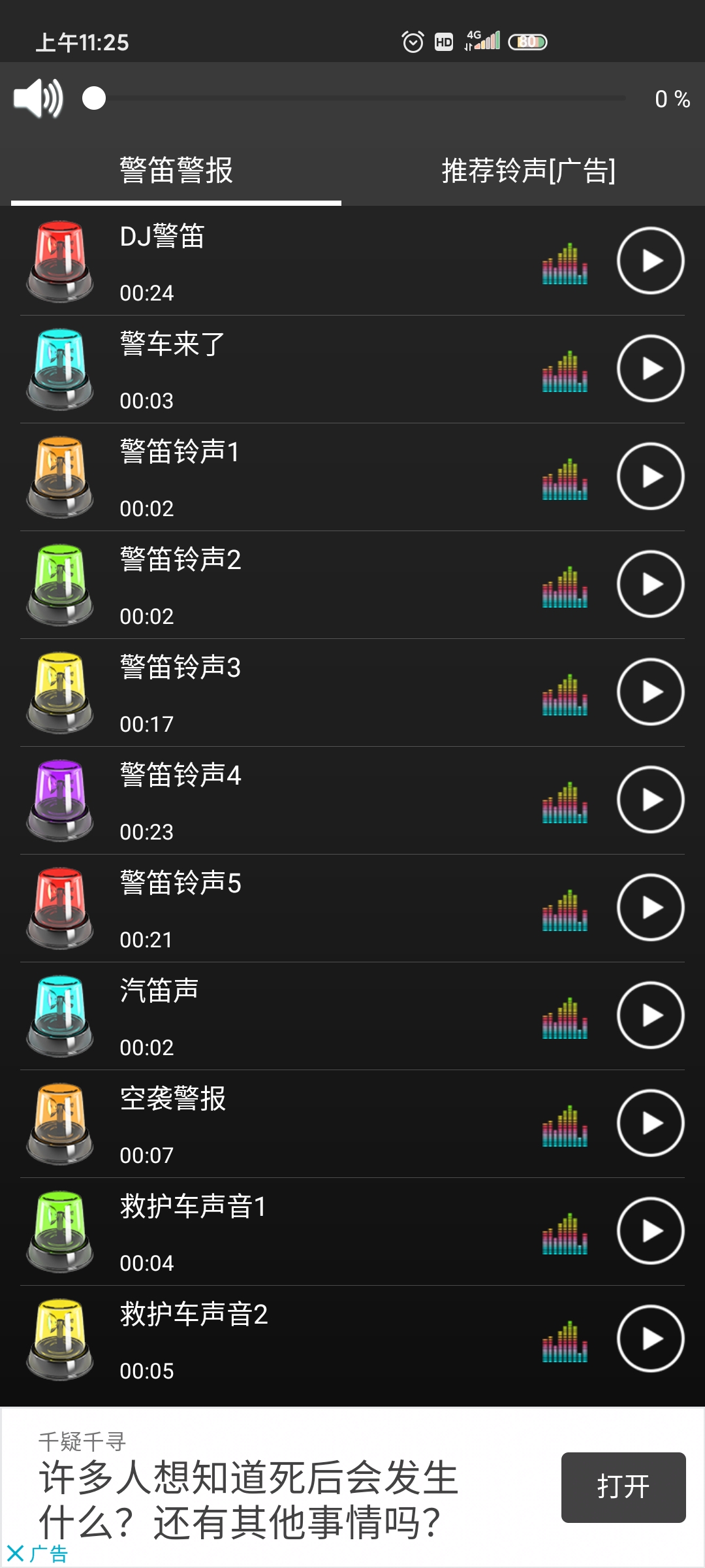 打开这个免费的超级响亮的警笛警报铃声应用程序,你可以按播放键选择试听每一首铃声。