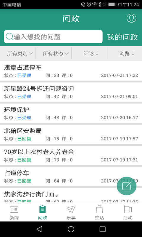 3、问政,与政府零距离沟通的桥梁,生活中的难点随手问政就能解决,非常的及时;