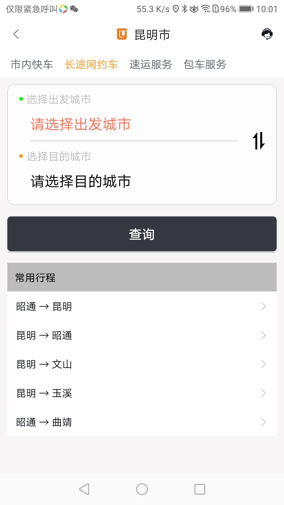 进入首页后,根据需求选择长途网约车、包车服务等对应板块;