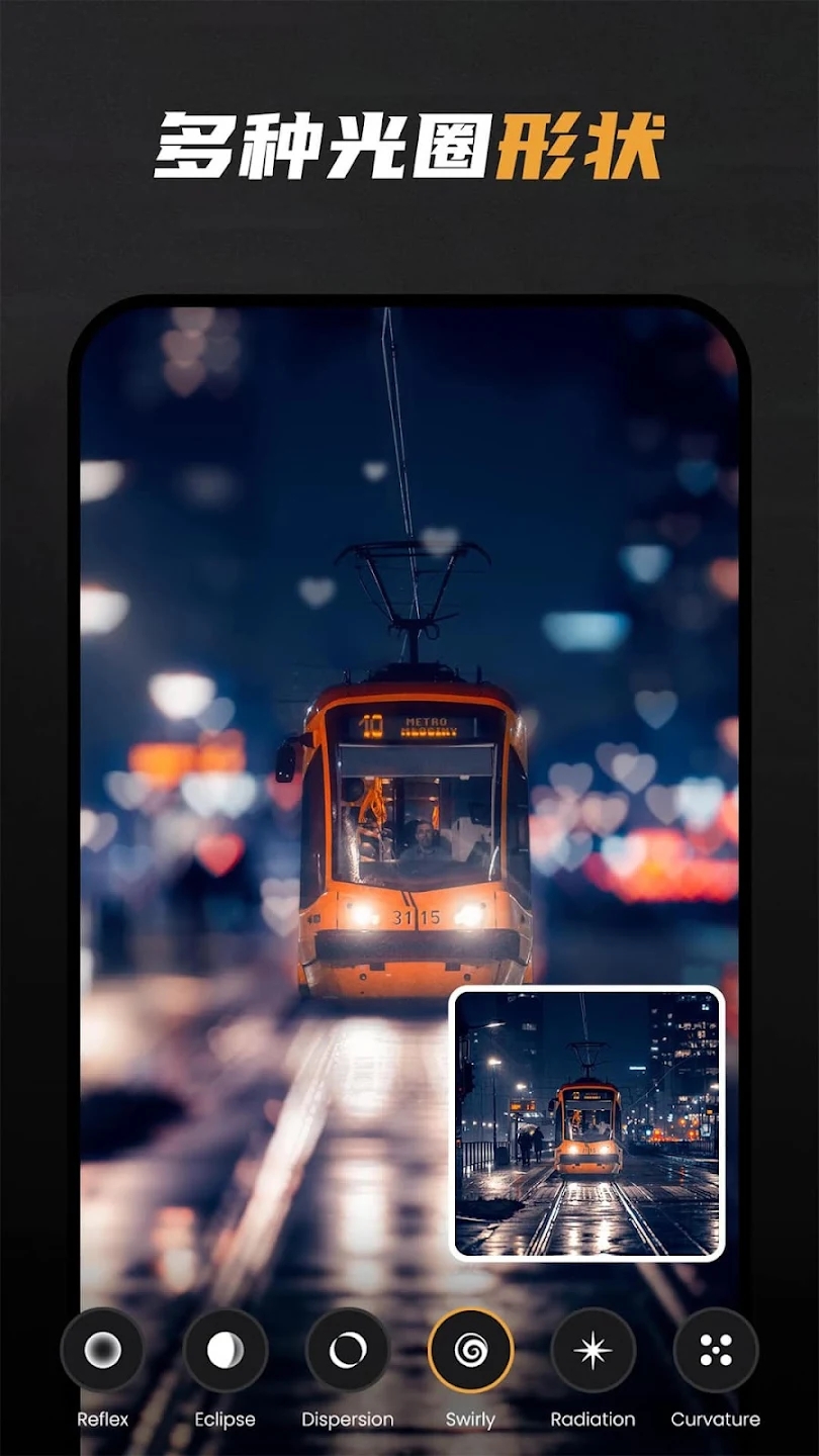 模拟快门叶片形状.丰富专业的光斑形状,如四边形.五角星.六边形.圆环.水滴.花瓣.心形.钻石.音符等。