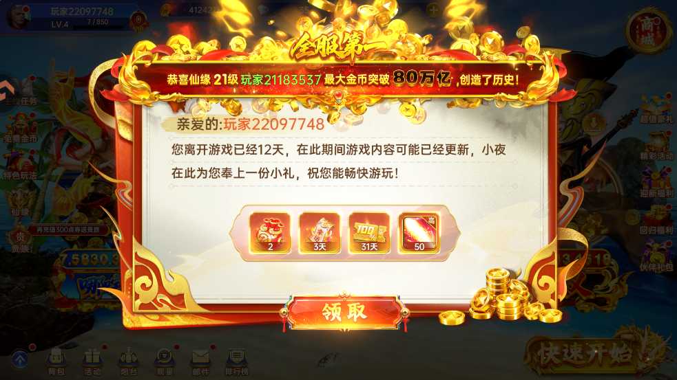 海量福利放送:登录即送金币,任务提供额外福利,轻松畅玩。