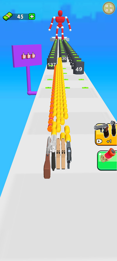 火力呈指数级膨胀:不同于传统跑酷,本作核心体验在于通过“倍增门”让子弹从几颗瞬间分裂至成千上万颗。那种满屏弹幕横扫赛道的视觉冲击力,能带给玩家极强的解压快感。