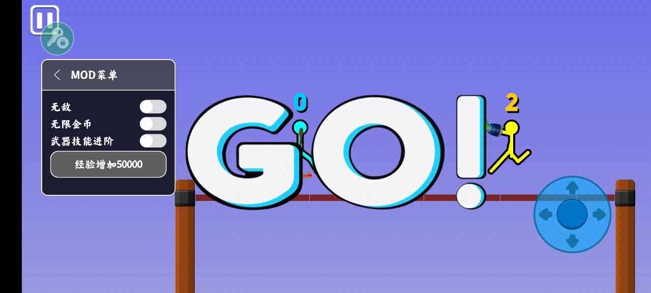 选定模式和人数后,进入对局准备界面。在这里,玩家可以为火柴人更换装备和皮肤等。准备完毕后,点击“GO”即可开始游戏。