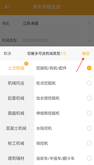2、接下来,请选择您想要发布的机械类型,注意最多可选三种。选择完毕后,点击“确定”。