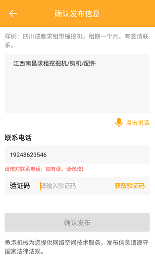 3、最后一步是填写具体的机械信息。完成填写后,点击“确认发布”即可成功发布您的机械信息。