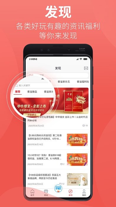 香溢家app是一款为烟民朋友服务的软件,香溢家app支持商品购买、兑换积分、流量充值等诸多活动,有了香溢家app广大烟民朋友再也不用愁买不到又真又便宜的好烟了!