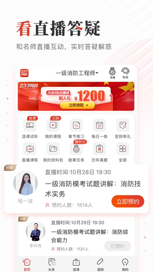 在线免费直播,必考知识点,考前押题,老师解析,历年真题讲解,考试须知等,手机听课兼刷题,重新定义在线教育平台的服务,互动教学,个性化辅导,资深教师带你提分拿证;