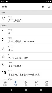 晴天钟app最新版是各位用户们准备的天气信息查询工具,按照经纬度显示天气数据,日落日出,月落月出等数据,主要用于天文观测,是天万台和各种天气观测者们必备的软件,在晴天钟及时了解最新的天气信息,方便各种气象工作的观测,还可以让你简单舒适的进行生活,有需要的用户赶紧来本站下载吧。