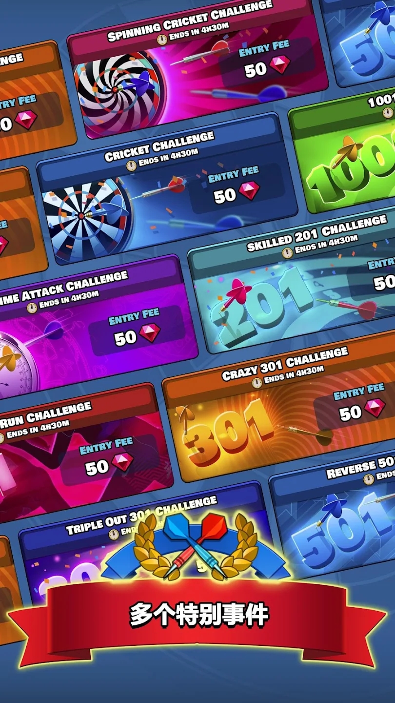 通过玩此款游戏并赢得比赛,您可解锁各种新的道具,并可将其用于定制您的飞镖!使用新的镖筒、镖杆和镖翼,您的飞镖将有独特的外观并获得性能提升。