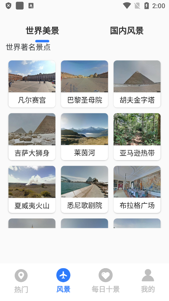 浏览全球的知名景点,并通过3D全景欣赏这些景点的美丽。此外,应用还提供每日推荐板块,向用户推荐不同景点以及相关的旅游信息。这样,用户可以在家中就能够畅游世界,了解各种风景名。