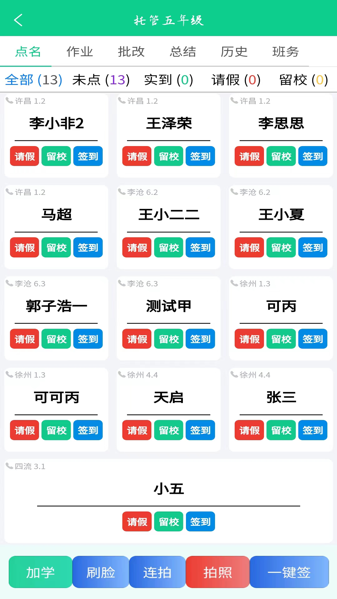 1、支持校门口刷脸、拍照、一键签等多种点名方式,实时记录学生签到、请假、留校情况。