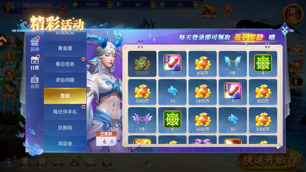 活动轮番上:设有深海寻宝、捕鱼赛事、充值送伙伴、累充回馈等各种限时活动。