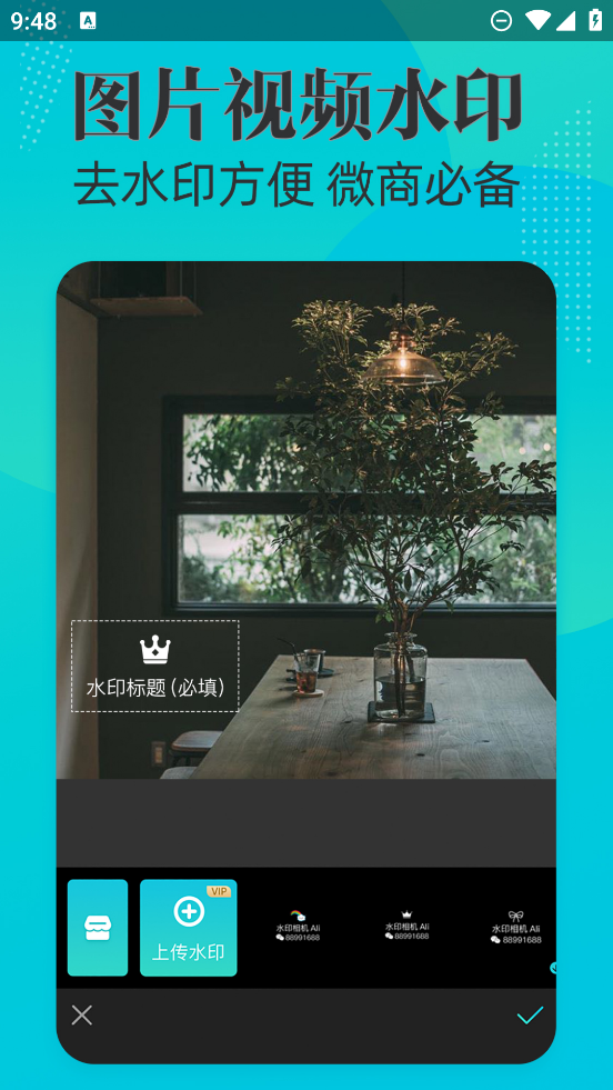 4、【视频水印】:视频加水印,水印大师相机更快更稳定;多种水印选择,支持自定义,视频以看得见的速度在合成;微信小视频更个性,微商小视频更有品,自媒体作者更好保护自己的作品版权!