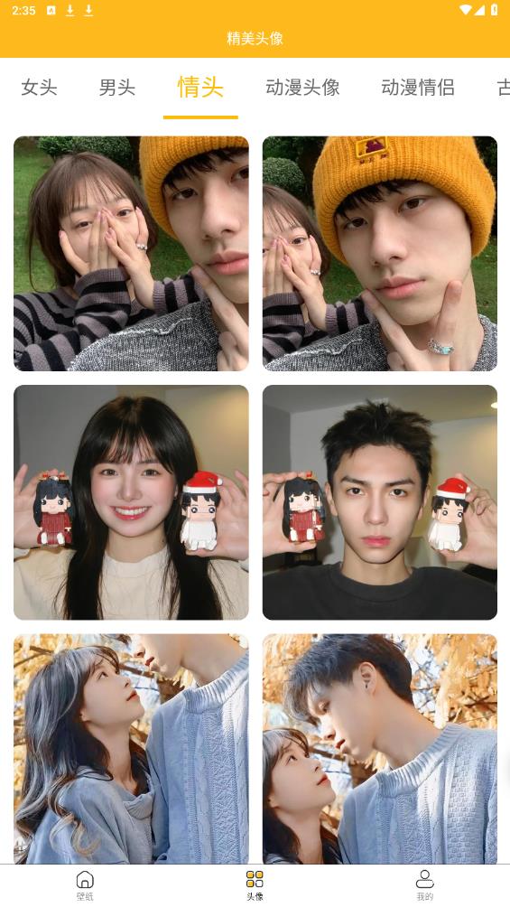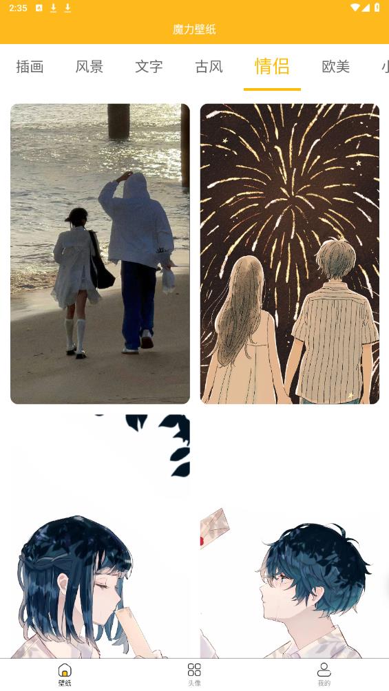 漫漫侠app壁纸界面有许多分类,包括插画、风景、文字、古风等,应有尽有,壁纸高清,选择喜欢的即可下载使用,非常方便;在头像界面还有动漫情侣、背景图、萌宠类图片,精选优质,实用性强,并且没有广告,完全免费下载。