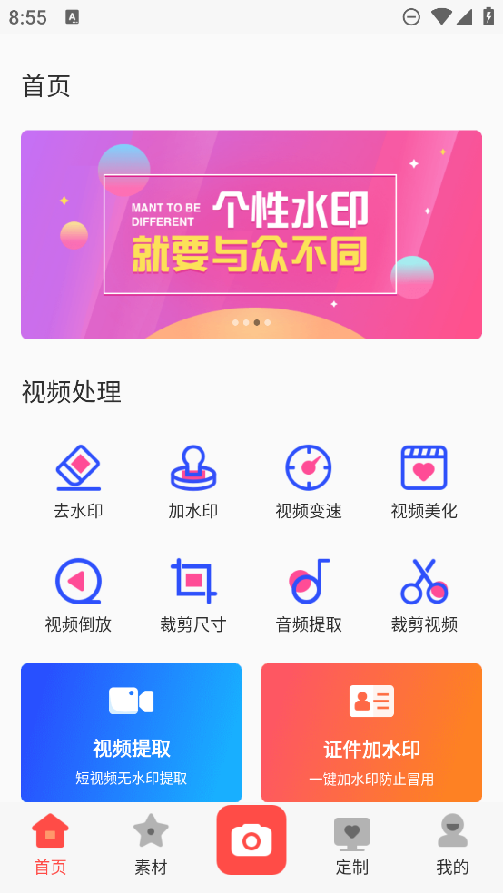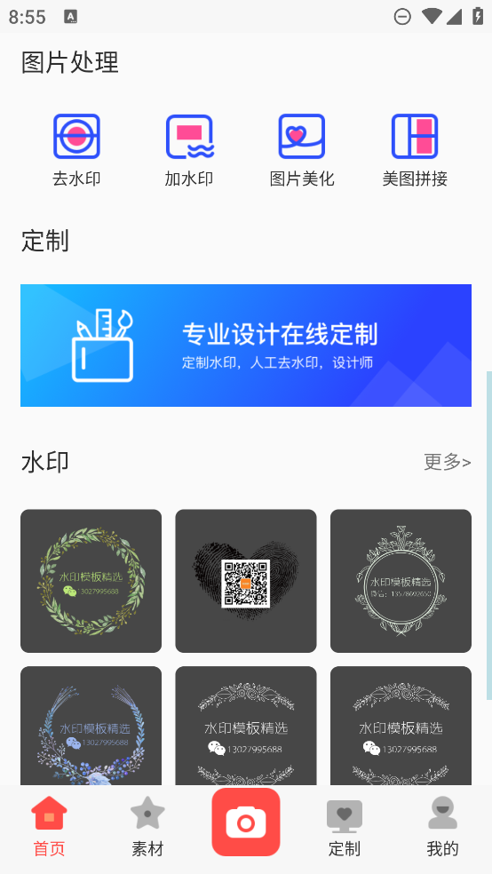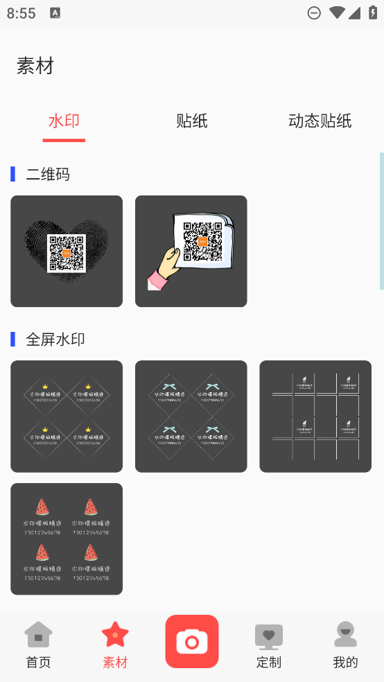 1、强大水印素材库,任意修改水印式样.二维码水印、全屏水印、几何水印、卡通水印、印章水印、花环水印、植物清新水印应有尽有.