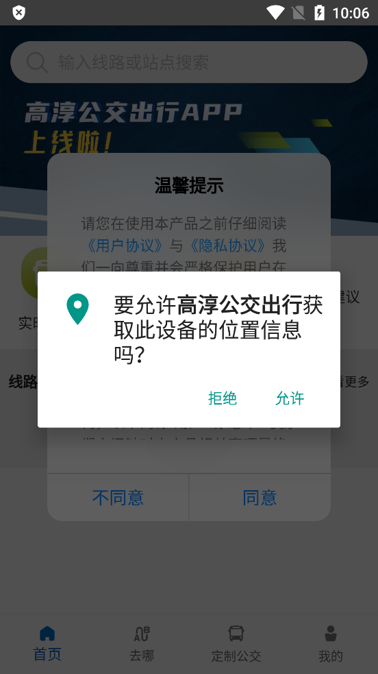 用户点击首页底部定制公交按钮进入定制公交页面,该页面提供了定制线路等功能,当用户处于无公交线路的区域可通过该页面发起线路定制。