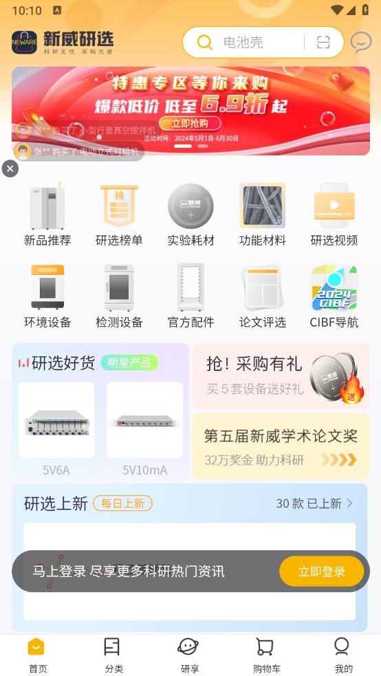 新威研选app针对科研采购需求而设计,旨在为用户提供一个高效的科研实验空间。我们承诺为用户带来优质的商品和满意的服务,同时关注并超越用户的期望,以此推动整个科研供应链的进步。目前,我们的商品种类已经覆盖了电池循环寿命测试仪器、实验用品等多个领域,力求为科研工作提供全面的支持。
