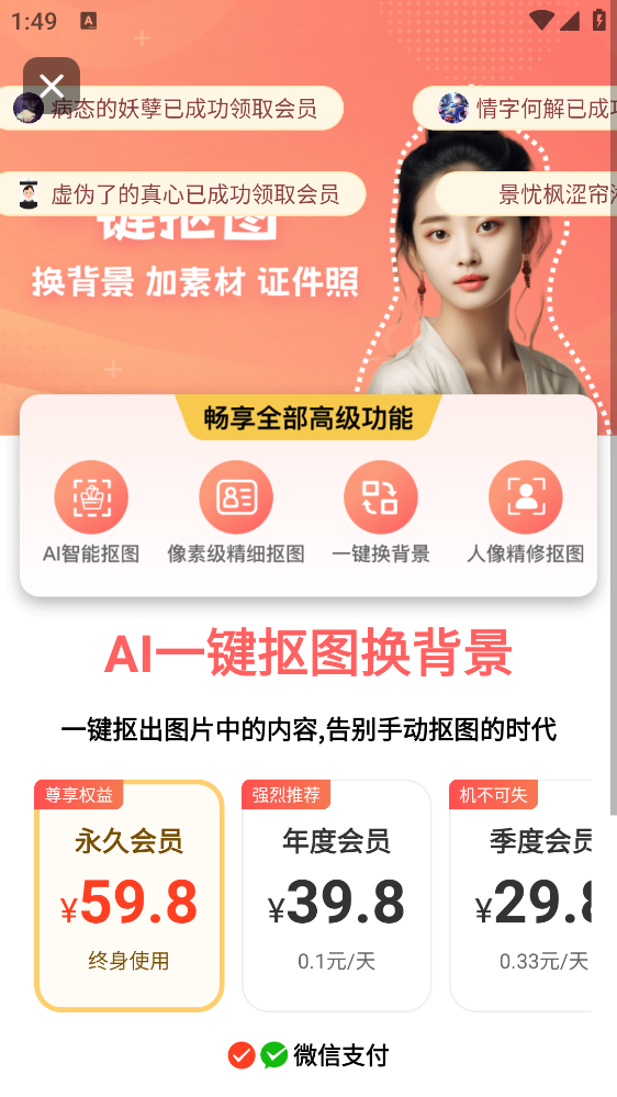 2、一键抠图换背景,ai智能抠图,抠物品、抠人像等多种抠图模式。
