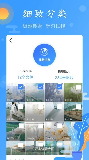 图片恢复app是一款可以帮助我恢复我们删除过的照片,有时候我们会误删一些珍贵的照片,然后没法找回来,现在大家不用担心了,图片恢复App帮你找回你删除过的照片,全方位扫描你的手机文件,极速查找,以后不小心删掉照片就再也不用担心啦~