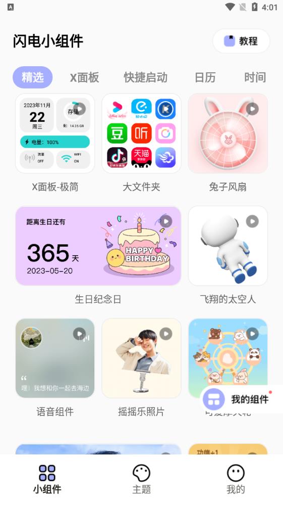 闪电小组件的小组件界面有许多种类的组件,X面板、快捷启动、日历、时间,设计都很好看;在主题界面,可以选择喜欢的主题,预览效果或者安装主题,还能自定义主背景;添加小组件时先选择需要的小组件,然后调整背景、图标圆角度数、透明度等,点击保存到我的组件,在我的组件的页面点击安装至桌面即可。