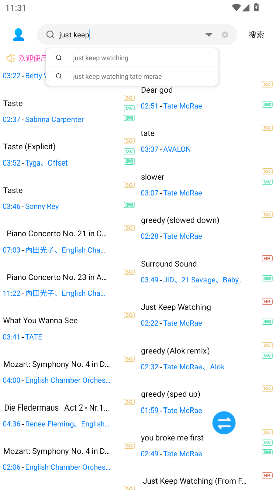 1.输入关键词搜索你想听的音乐