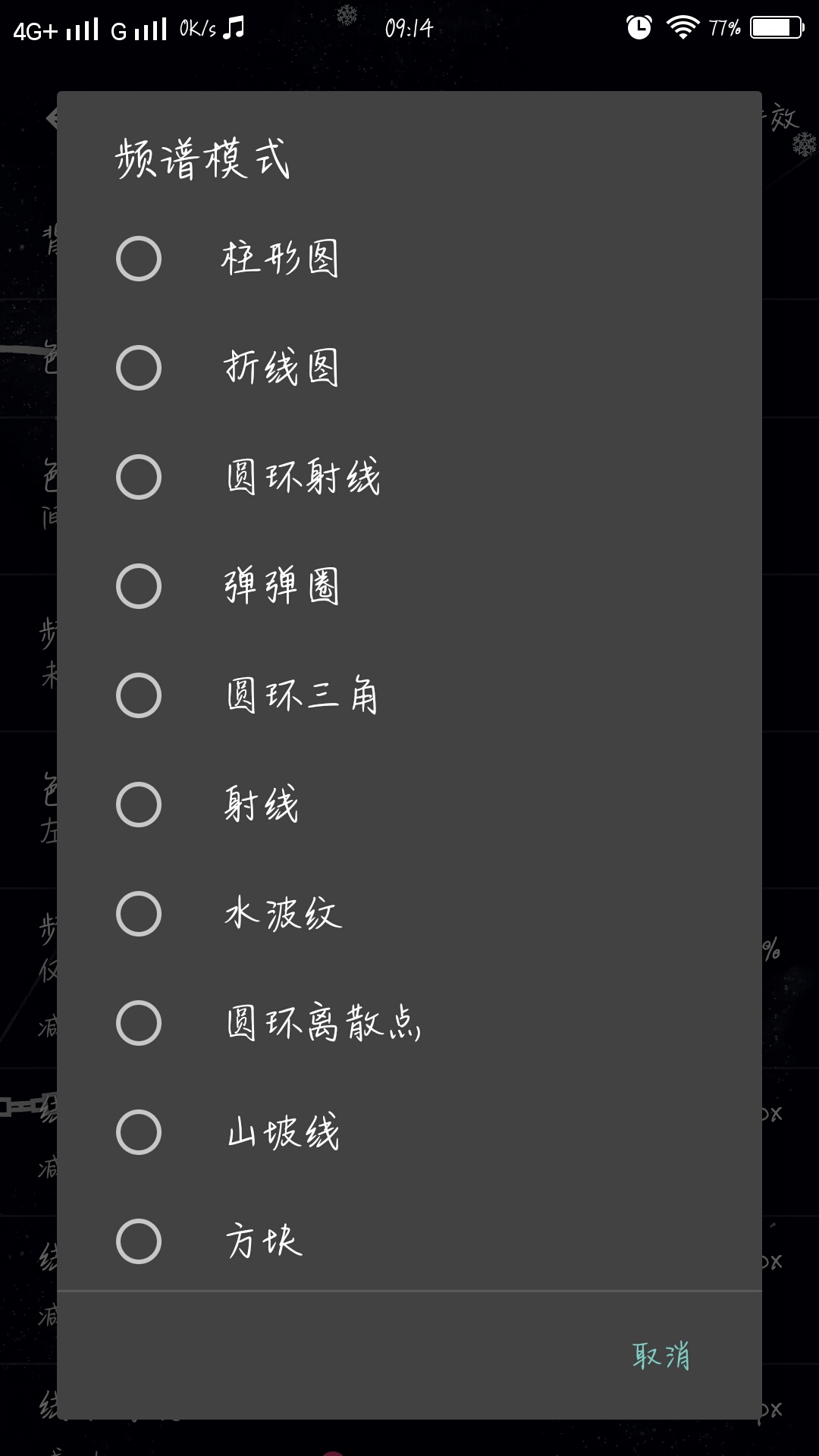 3.水波纹感觉很自然,频谱的高度.线条的宽度以及高度和间隔等自定义设置,还支持高帧率模式以及屏幕特效多选择,最惊喜的是可以自定义添加图片,这就变得很有趣了啊。