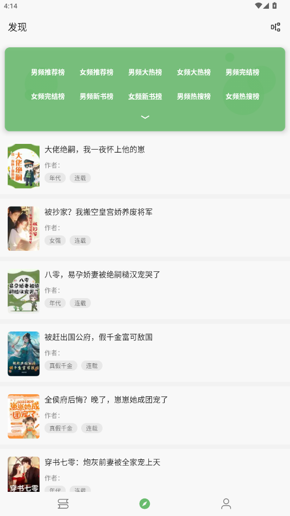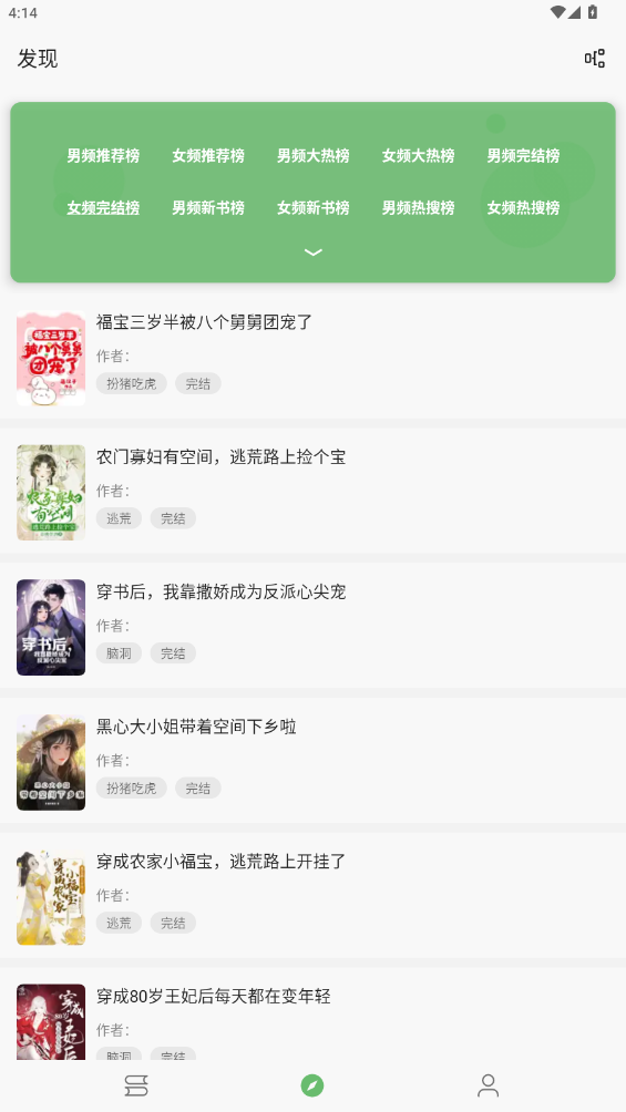4.排行榜单:提供各种热门榜单,如点击榜.收藏榜.完结榜等,帮助用户发现优质内容。