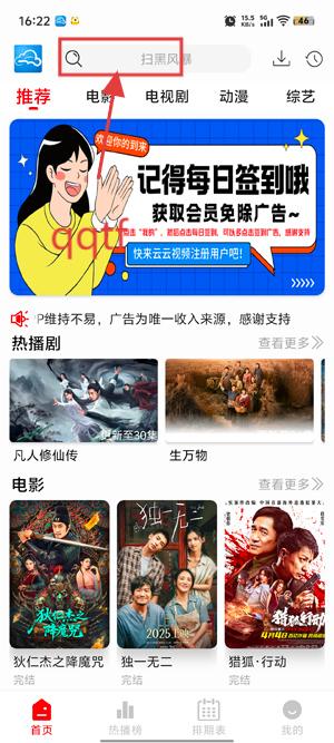 打开你的云云视频App,点击上方的搜索栏功能。