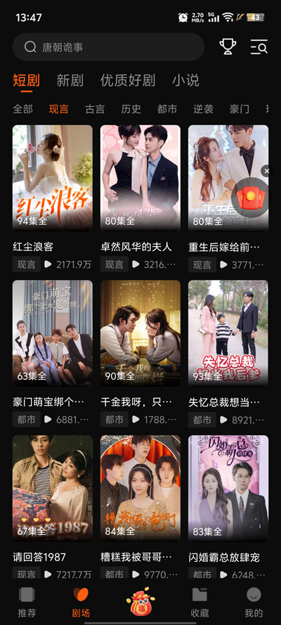 短剧:涵盖都市情感、古装穿越、言情、虐恋、霸总、甜宠等多种题材,满足不同用户的喜好。