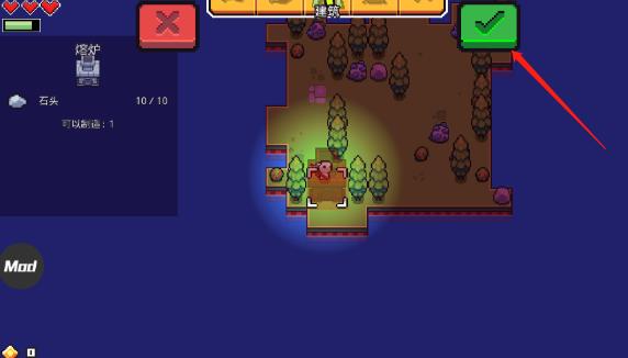 6、当石头都收集完成的时候,就可以建造熔炉,点击右上角的菜单,然后点击建筑,选择好熔炉需要放置的位置,点击【√】即可;