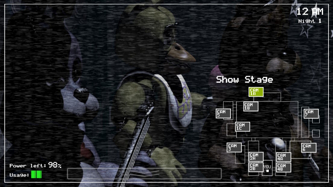 主人公是是一个披萨店的监控保安,这家店为了吸引孩子们而搞来了很多玩具熊,其实这些玩具熊的皮套下是机器人,玩家在午夜之后还要监控店铺内部,但是这些玩具熊莫名其妙地开始活动了,寂静的夜晚变得恐怖起来,而你则要这样子渡过五个晚上!!!