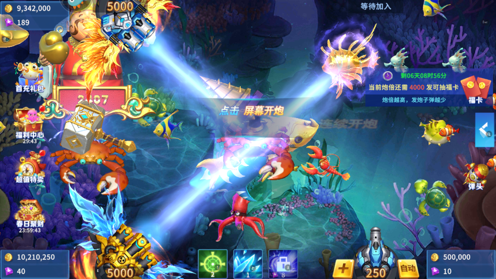 多人联机:在万人在线的联机渔场中,通过竞技和协作获得金币。