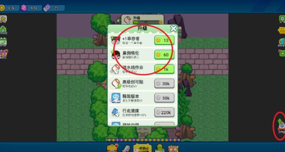 点击屏幕右侧的升级按钮,玩家可以花金币招募幸存者,也可以雇佣员工帮你