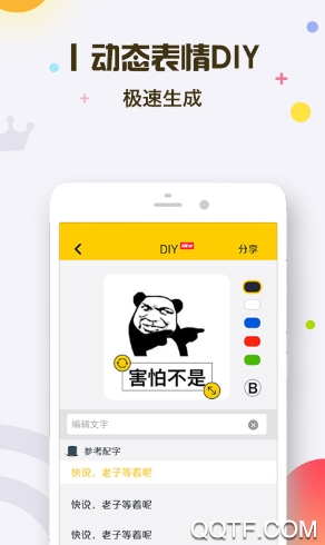 全能的表情DIY图文配功能,表情王国除了神级配字推荐外也可以根据自己的喜好挑选模板,发挥想象创意,秒做专属魔性表情,聊天斗图开外挂!两大强大功能,保证让你把对手噎的不要不要的!