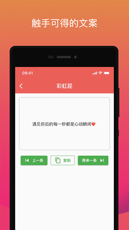 主题文案生成器,内包含彩虹屁、朋友圈文案、绿茶语录、舔狗日记、网易云神评、今日诗词、社会语录、二次元、抖音文案等几十种文案主题。一款拥有多种类型文案资源的手机文案生成器,各种素材尽在其中,多种文案主题可供选择,为用户带来更贴心的文案生成体验,超多文案一键生成。