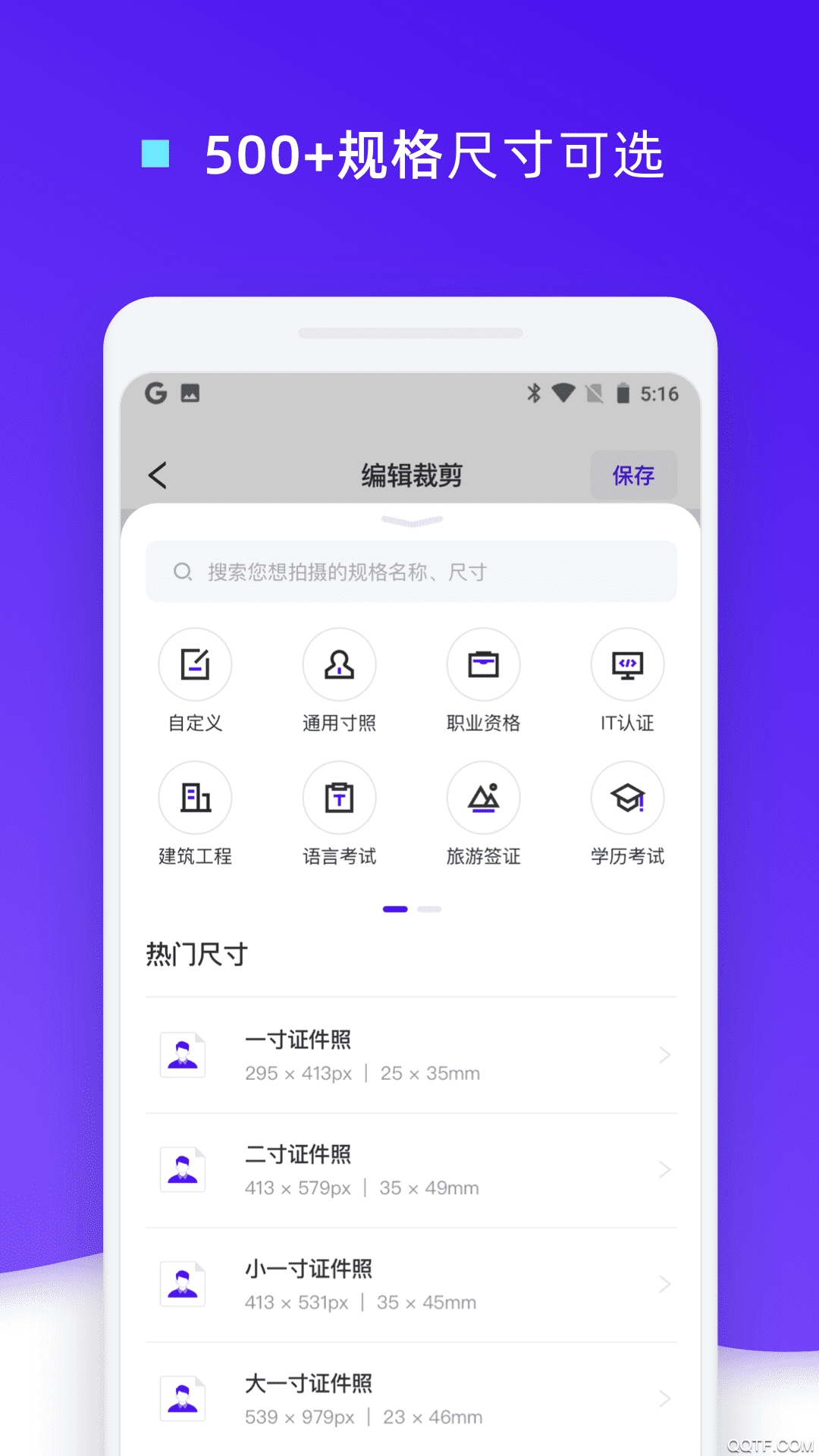 支持选择500+种规格尺寸,多种证件照场景分类帮助你快速选择。