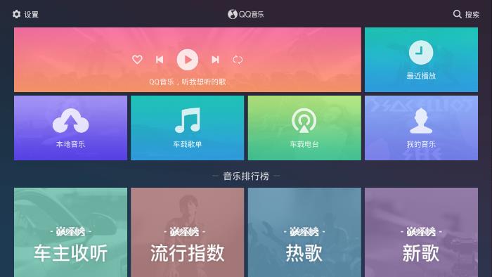 1.直观布局,功能尽显:成功下载安装QQ音乐车机版,您会发现界面简洁明了,主页清晰展示当前播放、最近播放、本地音乐、为你推荐、个性电台和我的音乐六大核心区域。配合左上角的“设置”和右上角的“搜索”,所有功能触手可及,轻松导航。