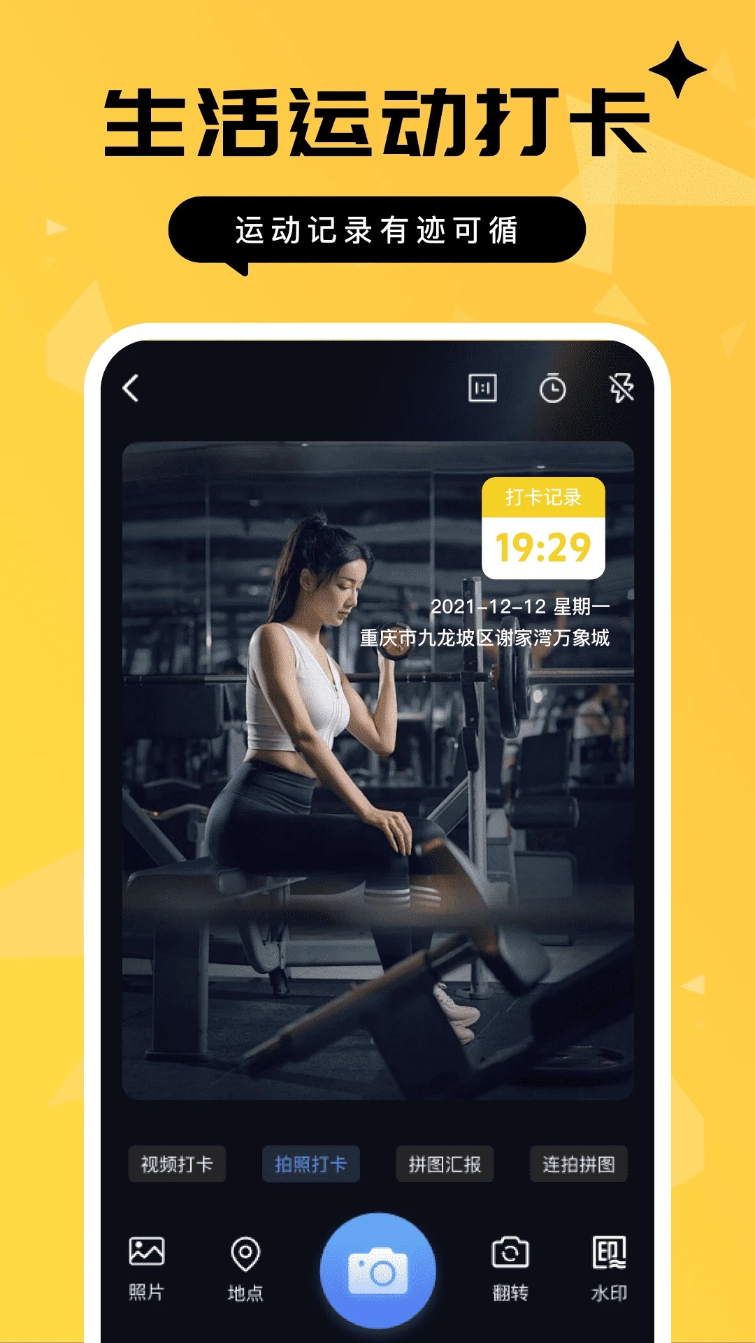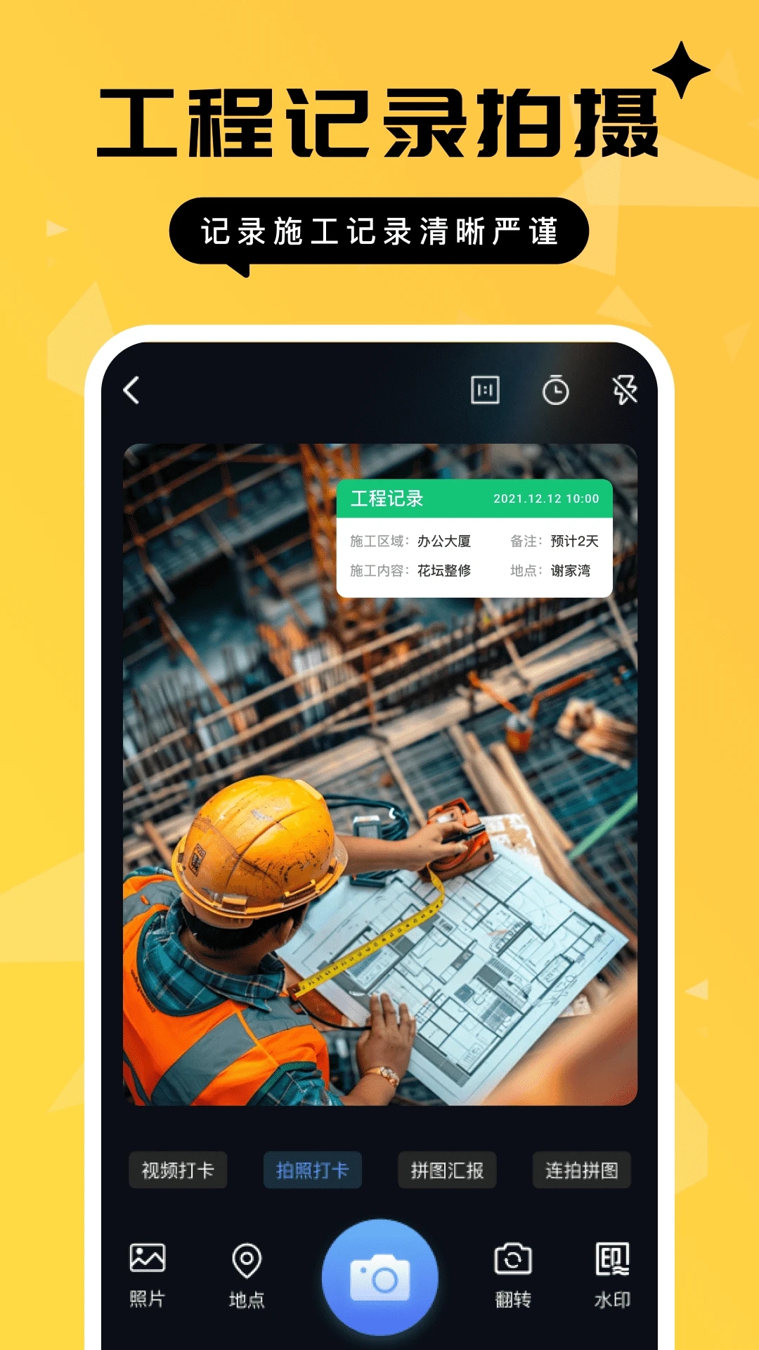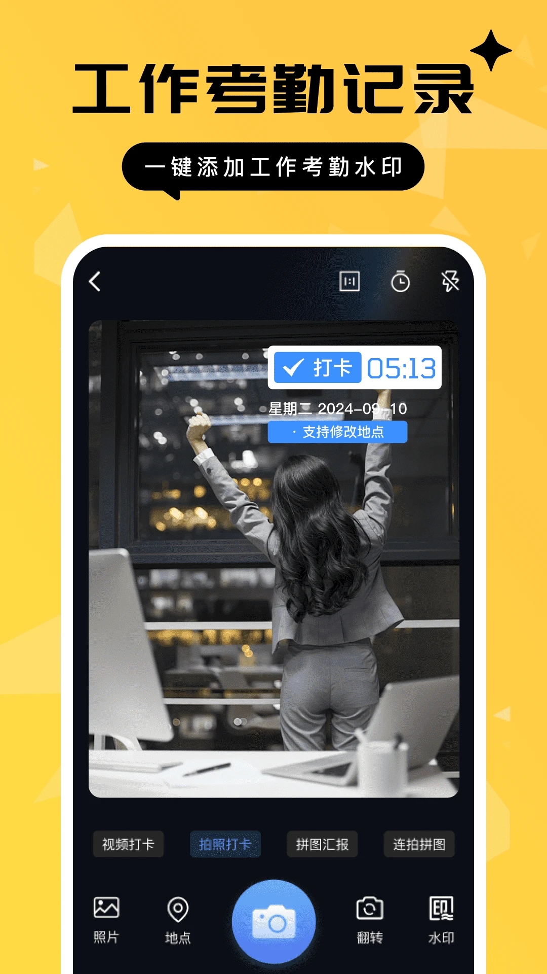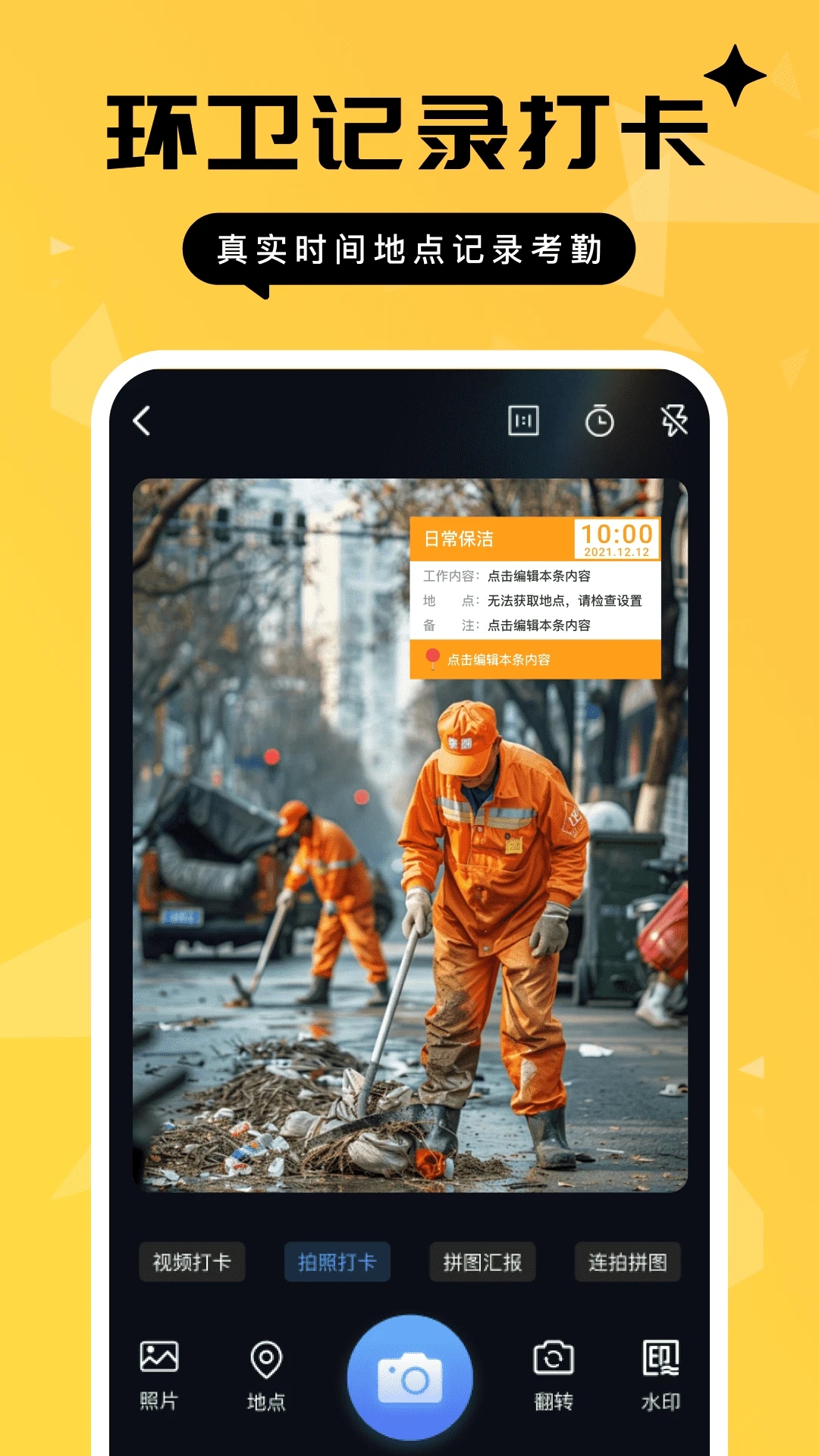 考勤打卡:可以自动添加时间、地点等信息,方便管理。
