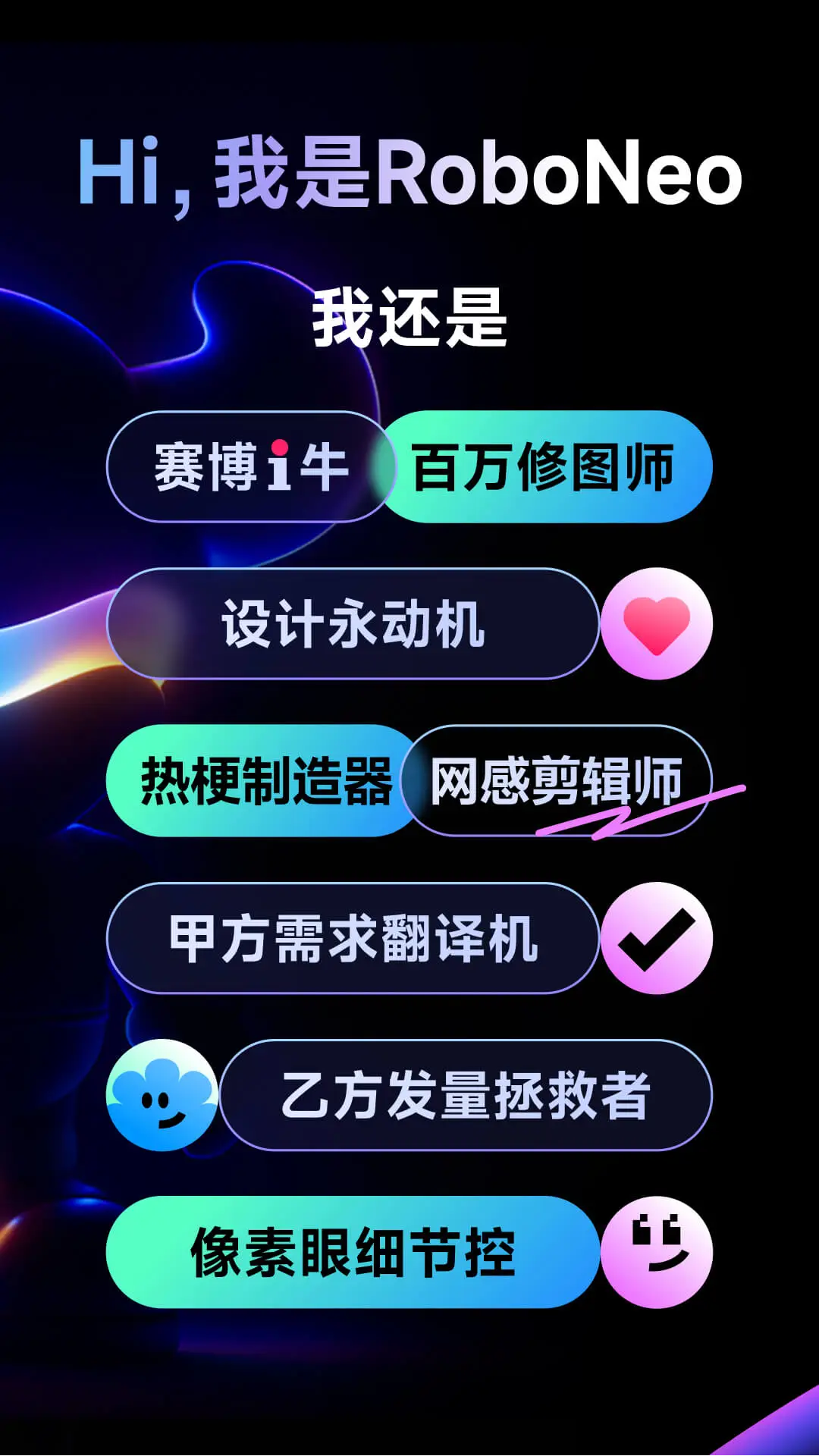对图片和视频有高频处理需求:无论是日常发帖配图、制作宣传海报,还是剪辑短视频、添加特效,RoboNeo的AI能力能显著提升工作效率。