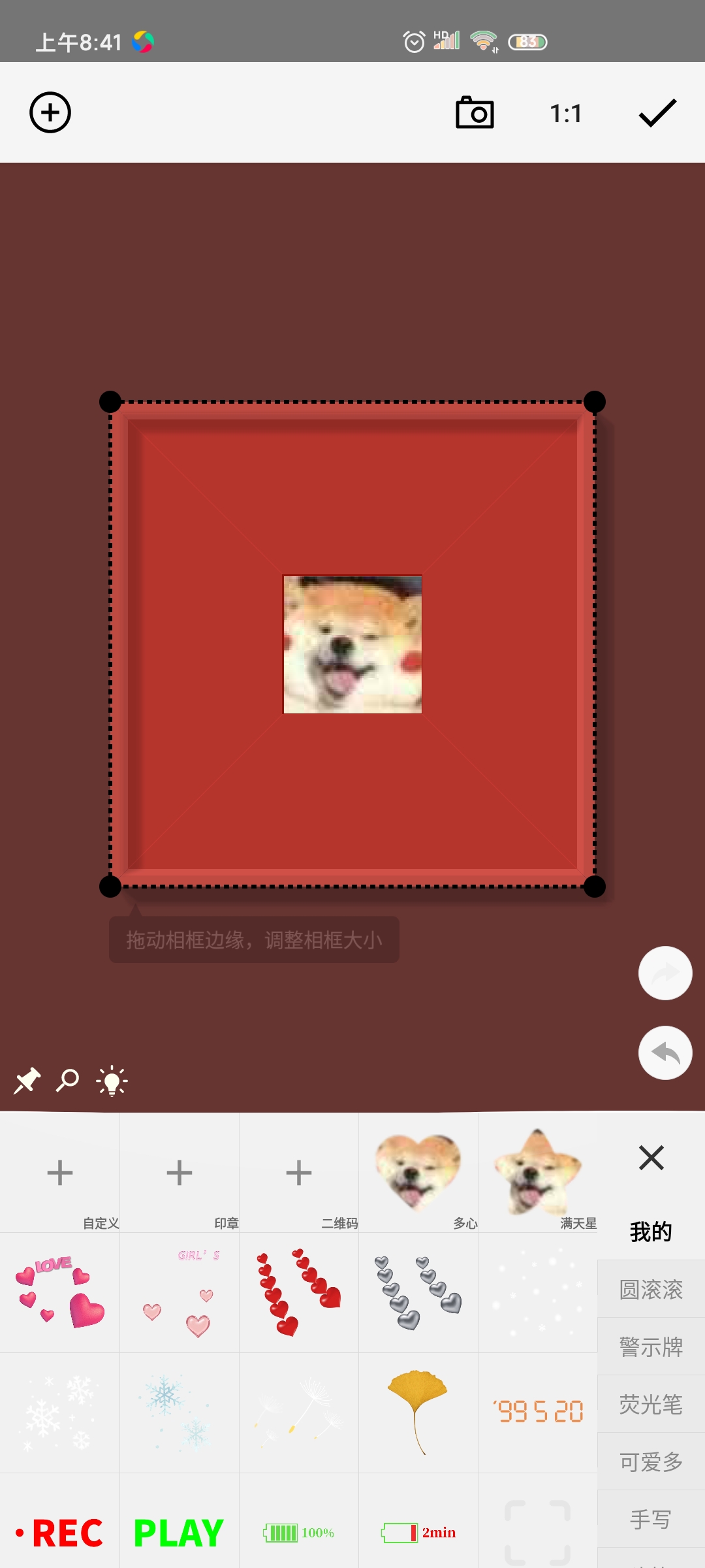 在主界面时候,拖动图片边缘可以调整图片大小、拖动相框调整相框大小。