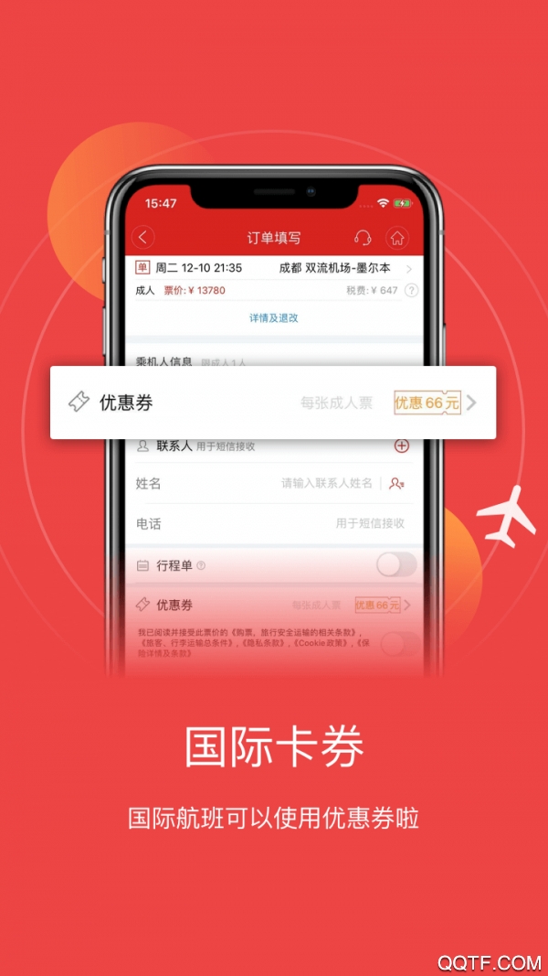 3、手机订票,预订本人机票,有机会获得300元、200元、100元购物卡