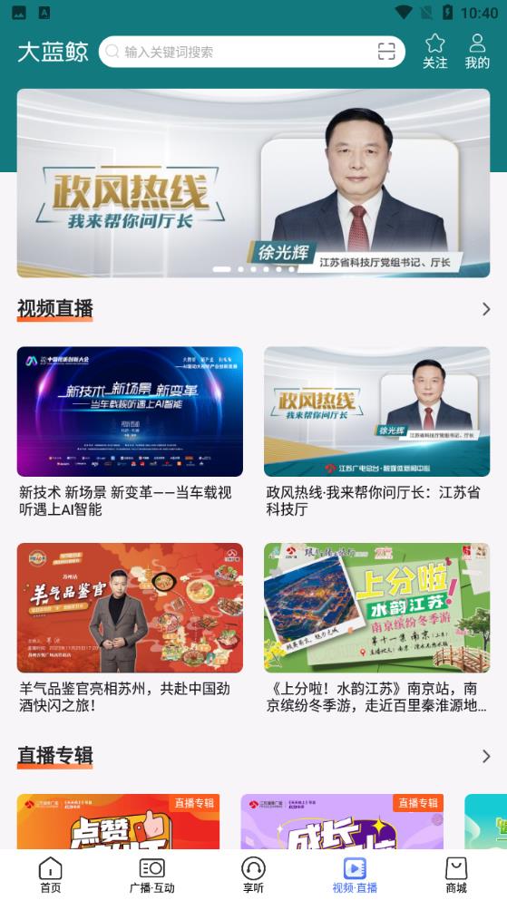 大蓝鲸app首页有新闻资讯、热门专辑、主播精选等板块,还有政风热线、交广双声道、大蓝鲸阅分享等内容;在广播互动界面还可以听广播,查看主播号、节目号、活动号等,以及关注等;享听界面可以听取热门专辑。