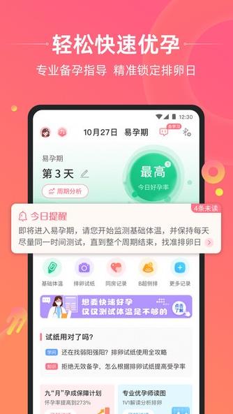 1.【周期记录+智能分析】你只需要记录你的基础体温、宫颈粘液、排卵试纸、同房记录等,智能分析帮你锁定排卵日,找到比较佳同房时机;