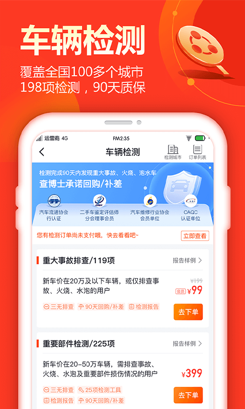 2、检测;将覆盖全国90多个城市,进行专业检测VIP一对一服务。专业检测师,平均从业三年以上,配合app打造智能检测工具,进行多达198项专业检测,出具车辆车况保障协议,随时提供专业支持,并享90天三大问题(重大事故、水泡、火烧)包退服务,尊享理赔无忧!