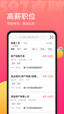 597直聘app直聊好工作官方版是一款靠谱的招聘求职软件,在597直聘海量高薪职位智能推荐,精准匹配用户的求职需求,海量名企在线招聘,各种优质的工作机会随你挑选,视频面试在线和老板进行面谈了解公司的相关信息,厦门597直聘为各位求职者们提供真实靠谱的求职信息,还有海量优质功能方便大家快速的找到自己心仪的工作岗位,有需要找工作的用户赶紧来本站下载吧。