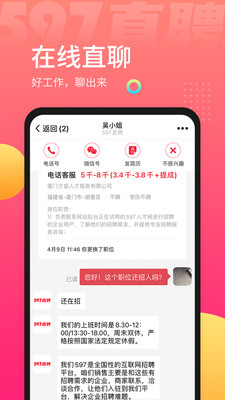 2、【职位全面】597直聘app日均在线60万+职位,只要你自信;