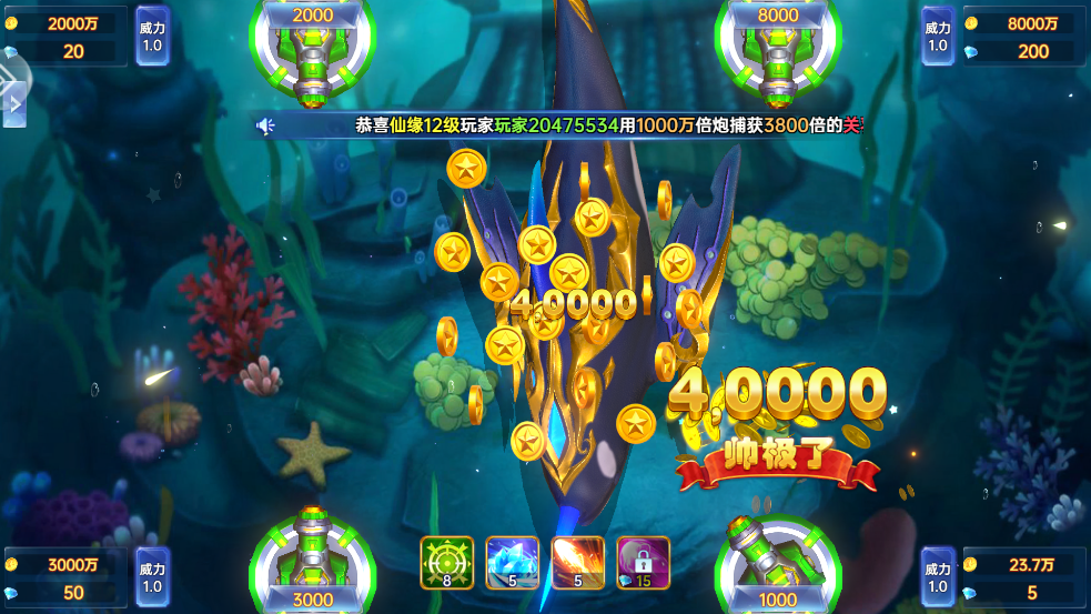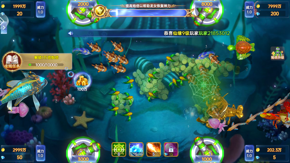 技巧:优先升级常用炮台,炮倍设置建议不超过当前金币量的1/2000,避免消耗过快;结合狂暴、激光等道具提升捕鱼效率,快速积累升级资源。