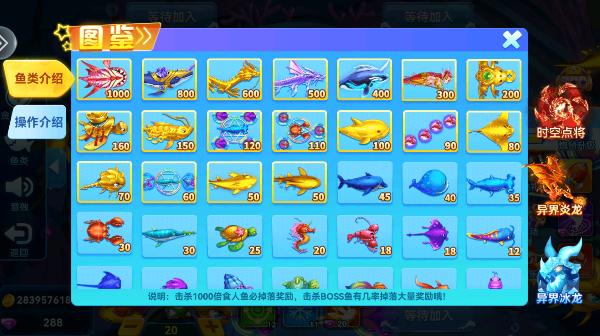 3、打开后即可查看所有鱼类及游戏物品的详细图鉴,了解它们的分值、特性与出现场景,助你捕鱼更高效。