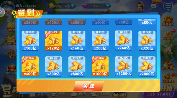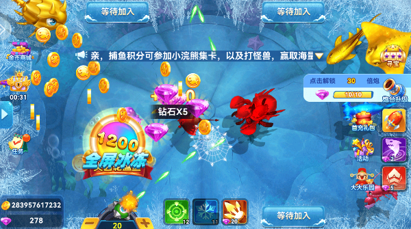 千炮捕鱼电玩城一炮轰出,鱼群四散,满屏金币飞舞,沉浸感十足!解锁并升级专属千炮、万炮乃至百万火力炮台,体验“一炮清屏”的极致快感!特殊技能炮(如追踪炮、冰冻炮、全屏炸弹)助你轻松捕获高分鱼王,金币如雨倾泻而下!